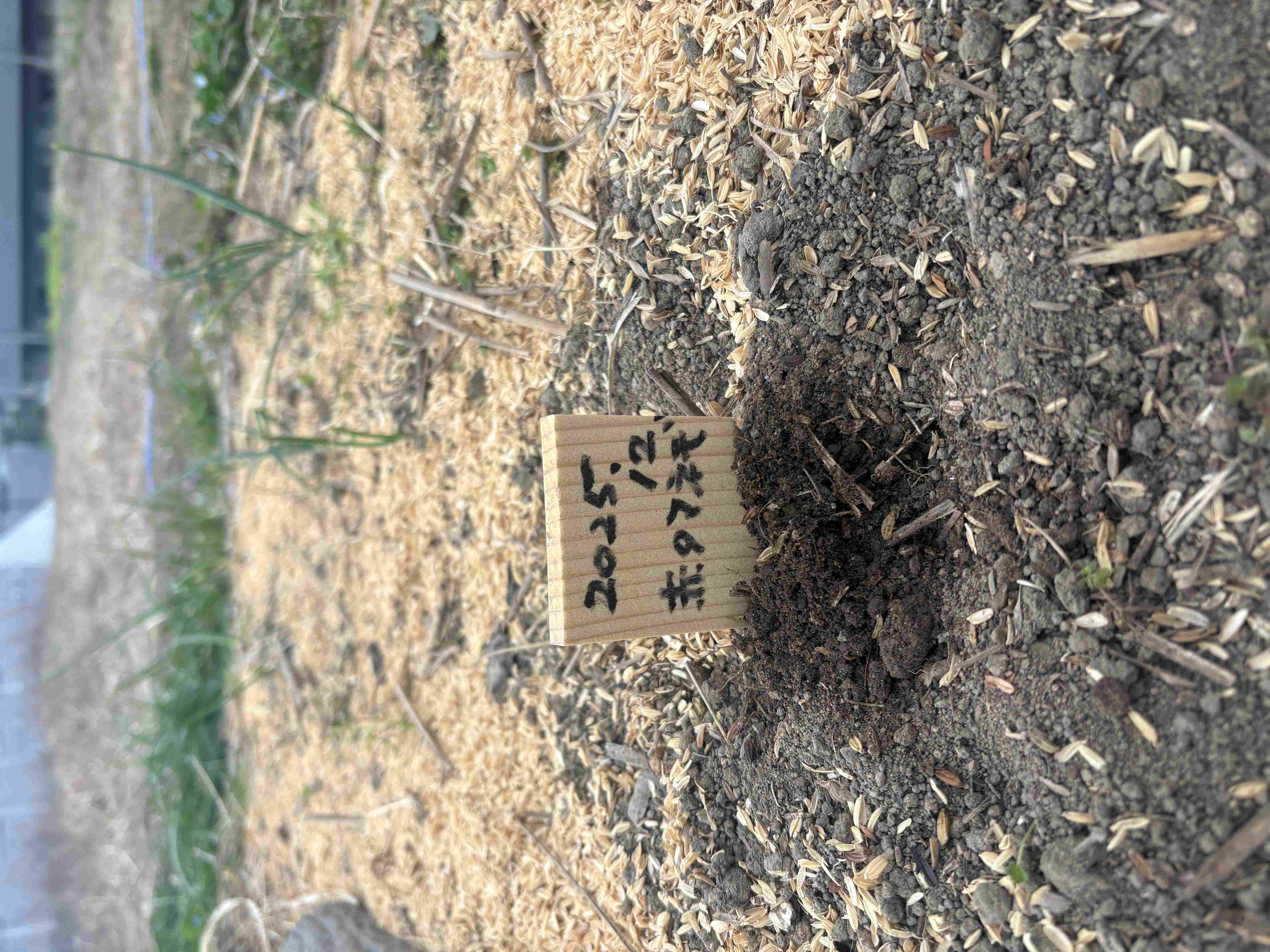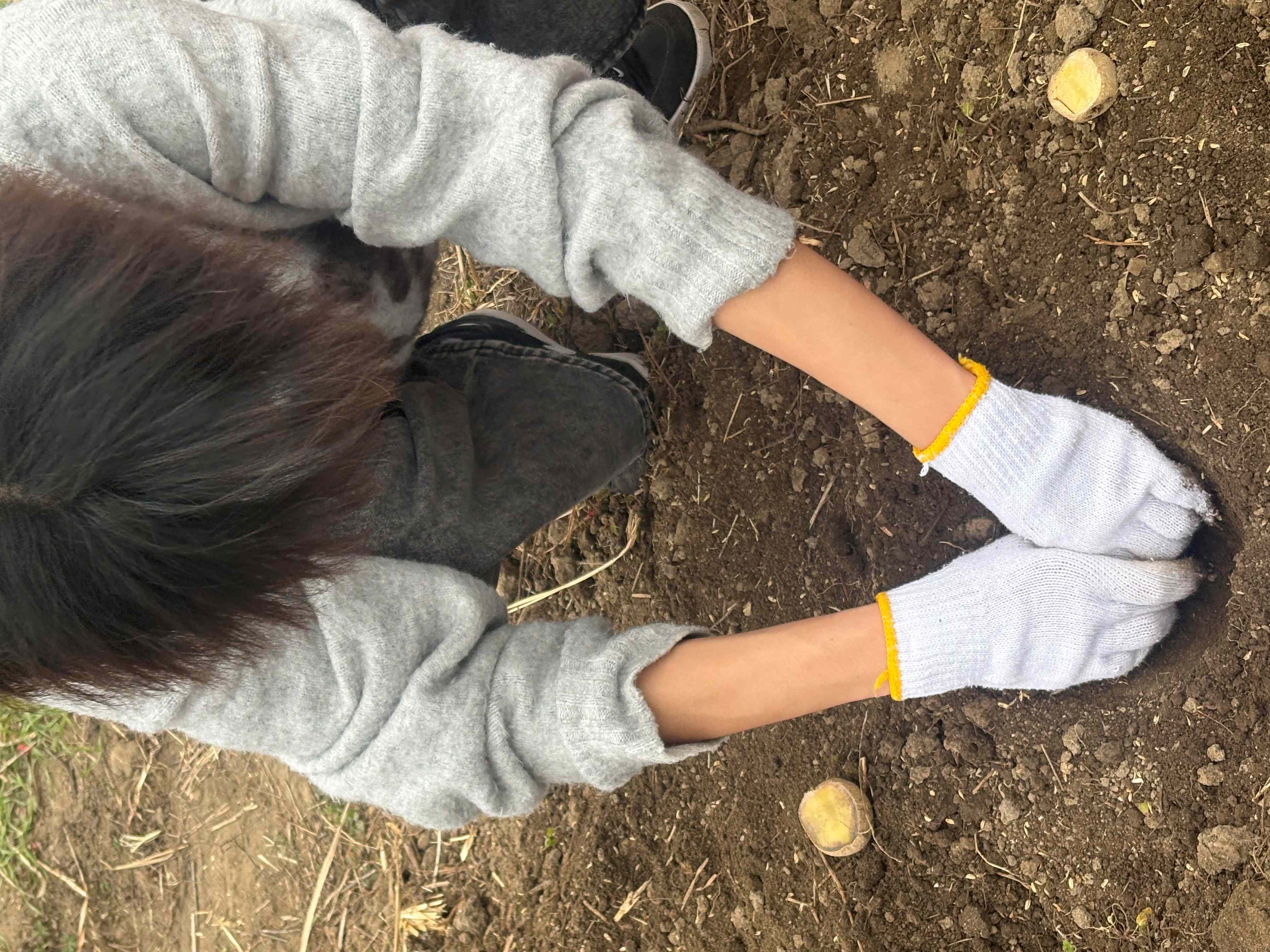 しっかり芽が出ることを願い、各自それぞれ植え付けました。畝をならし、防寒のため、草をかぶせ重しの土をまいて、植え付け作業終了~。